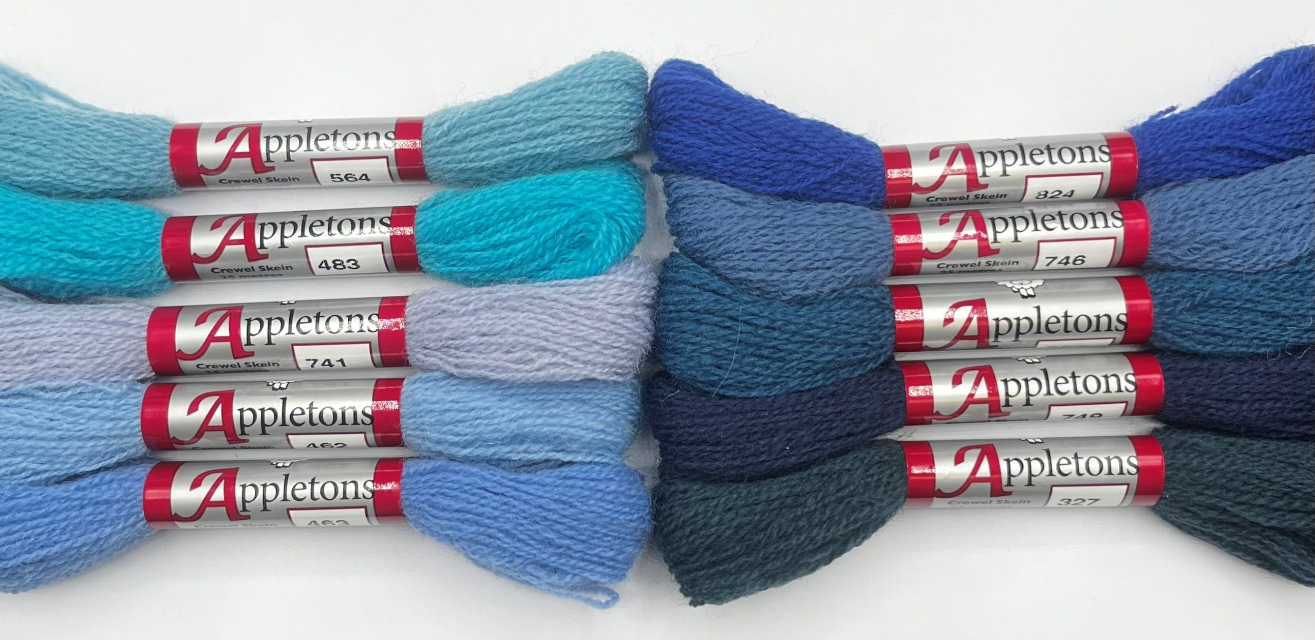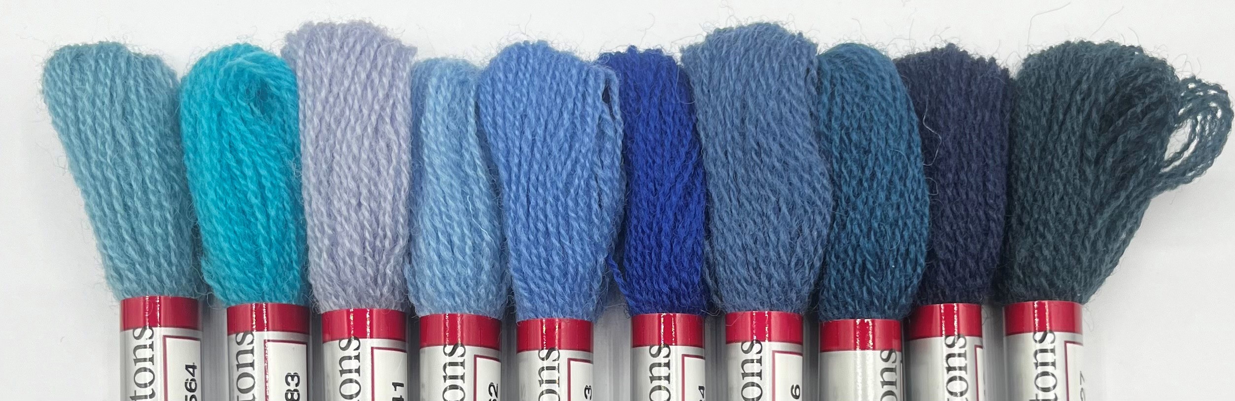 A preselected range of 10 crewel skeins (each 25m in length) to help explore the colour palette. Blues contains the following shades: