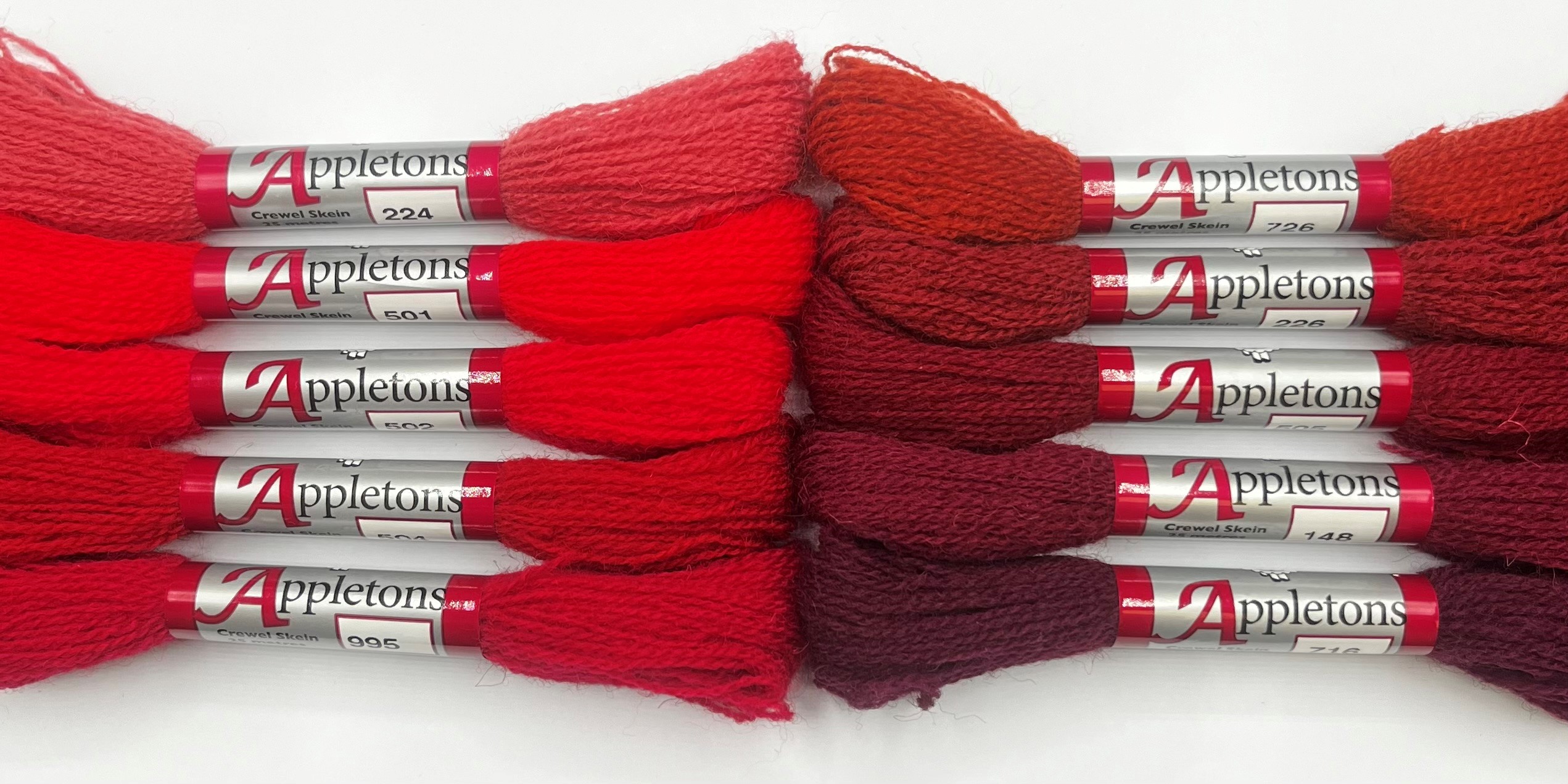 A preselected range of 10 crewel skeins (each 25m in length) to help explore the colour palette. Fire contains the following shades:
