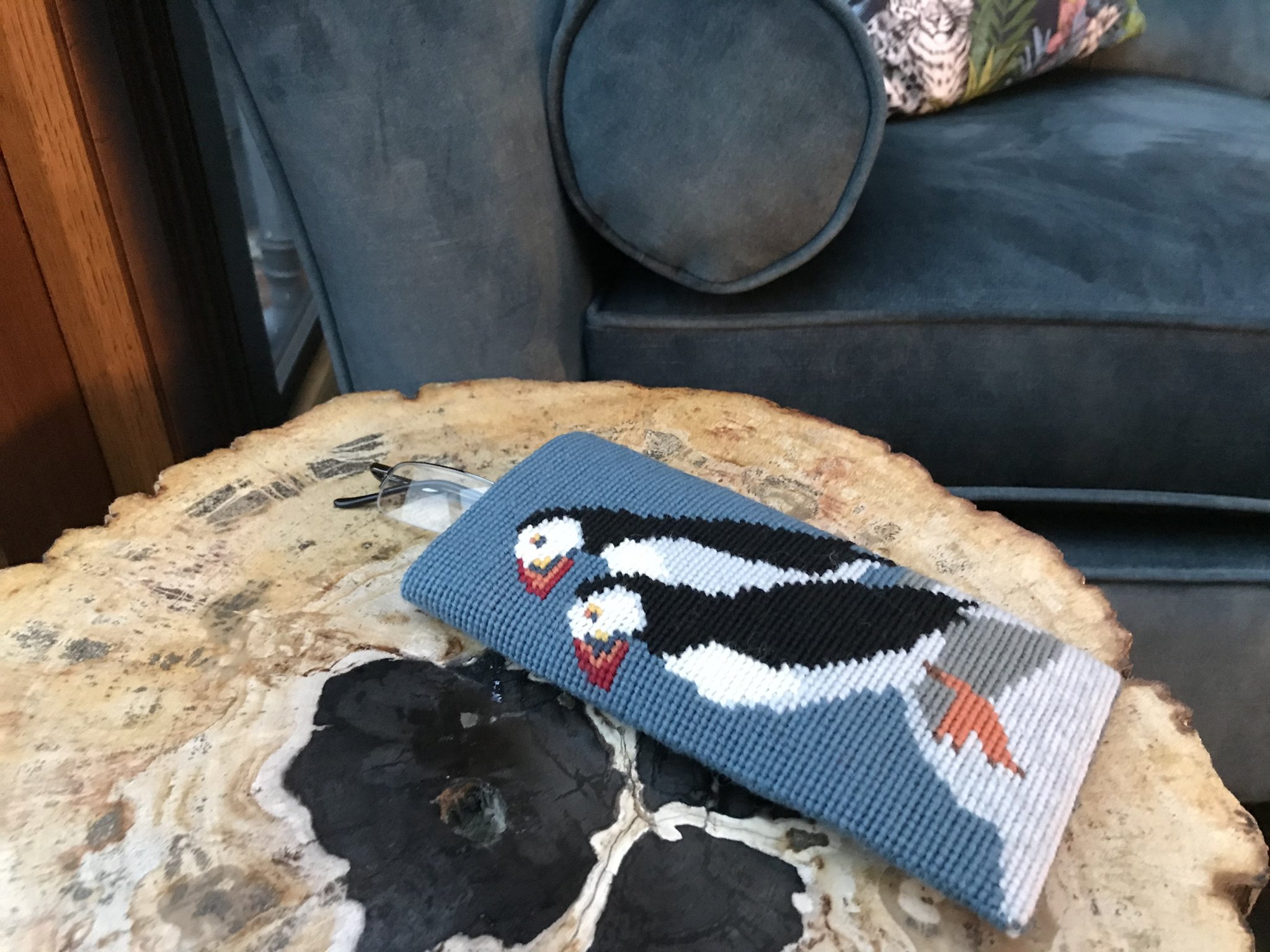 Puffins are colourful pint-sized seabirds that can be found around the British coastline over the summer months and are an example of the great variety of birdlife found in our islands. Here they have been turned into a practical and beautiful glasses case; the design is repeated on the reverse.